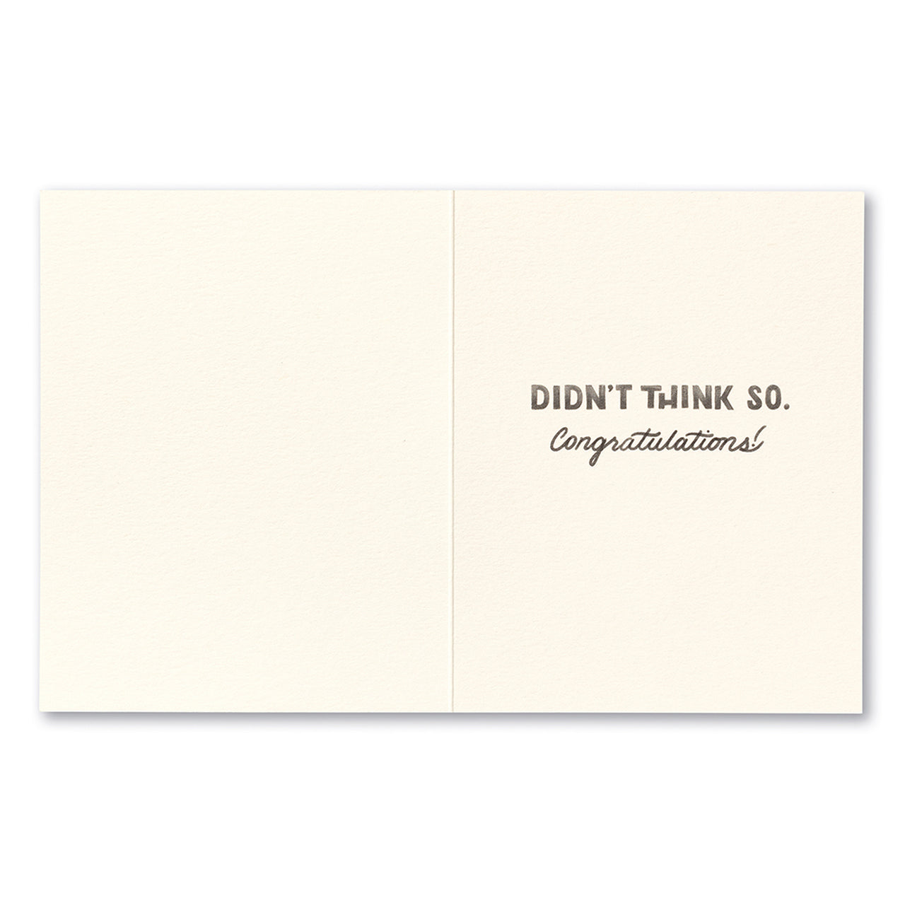 Inside: Didn’t think so. Congratulations! Unexpectedly playful and thoughtfully sweet, our new Love Muchly card line brings surprise and delight to any occasion. These bighearted cards combine hand-drawn illustrations and sincere sentiments to celebrate all of life’s moments. Size: 4.25”W x 5.38”H with envelope.