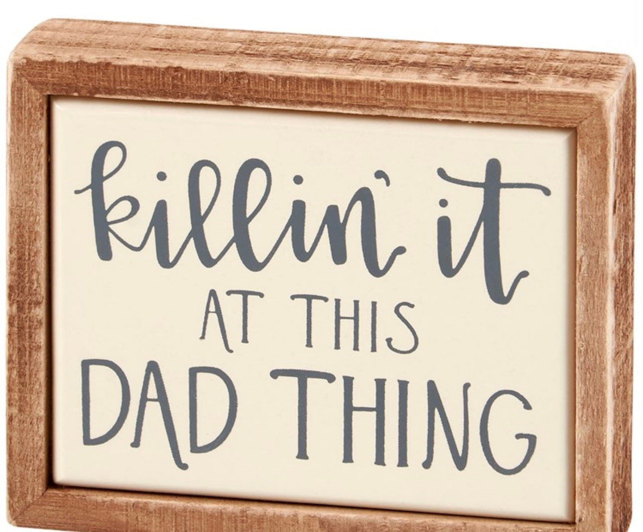 A small wooden box sign displaying a fun dad-themed sentiment in a unique hand illustrated style that reads "Killin' It At This Dad Thing." Box sign features a natural wood frame and faux enamel finish behind design for a tile-like appearance. Our Killin' It box sign mini is easy to hang or can free-stand alone. A fun everyday gift or home accent that can easily blend into any display.