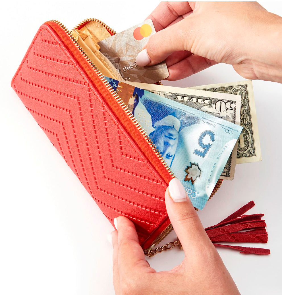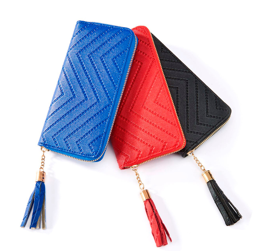 Faux leather wristlet pouch features a zipper and clasp closure wrist strap. Gold metal accents. Available in 2 assorted colorways: Burgundy, Navy. PU, Polyester. Each sold separately. PU Leather and Polyester.